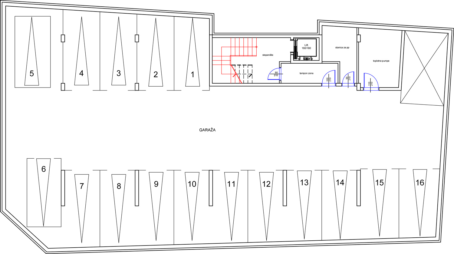 Svaka stambena jedinica ima obezbjeđeno parking mjesto, uključujući 43 garažna mjesta u podrumu zgrade. Garažna mjesta su šira od 3m što je znatno veće nego standardno parking mjesto. Podrum je opremljen sprinkler mrežom za zaštitu od požara kao i senzorskom ventilaciom za odvod štetnih gasova. Rampa za silaz u podrum je natkrivena, sa 15% pada i širine preko 6 m, što je više nego dovoljno za nesmetan silaz.